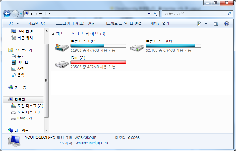 C드라이브는 SSD쓰는 메인하드D,G드라이브는 외장하드(파티션나눔)D드라이브는 외장하드에 윈도우즈 깐거고G드라이브는 데이터파티션인데데이터파티션 용량 500MB도 안남았어요 ㅠㅠㅠㅠㅠㅠㅠㅠ(영화 53GB, OS이미지 63GB)