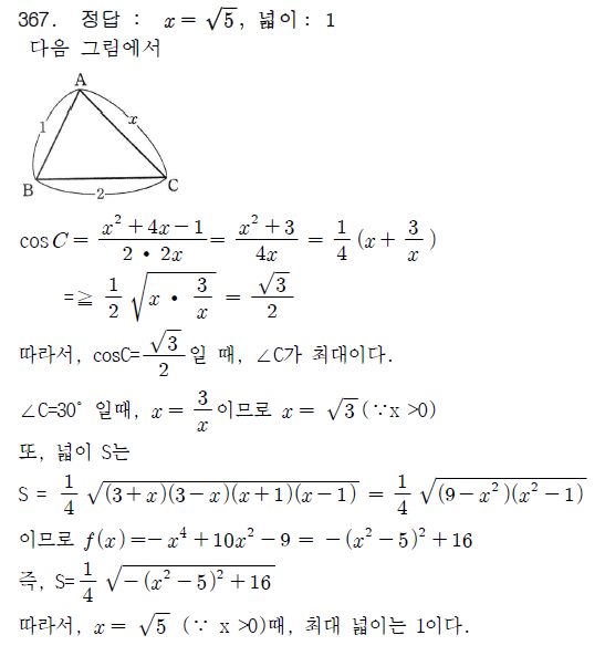 최대 넓이는 1, 그 때 B는 직각이므로 피타고라스의 정리에 의해 x는 루트 5.