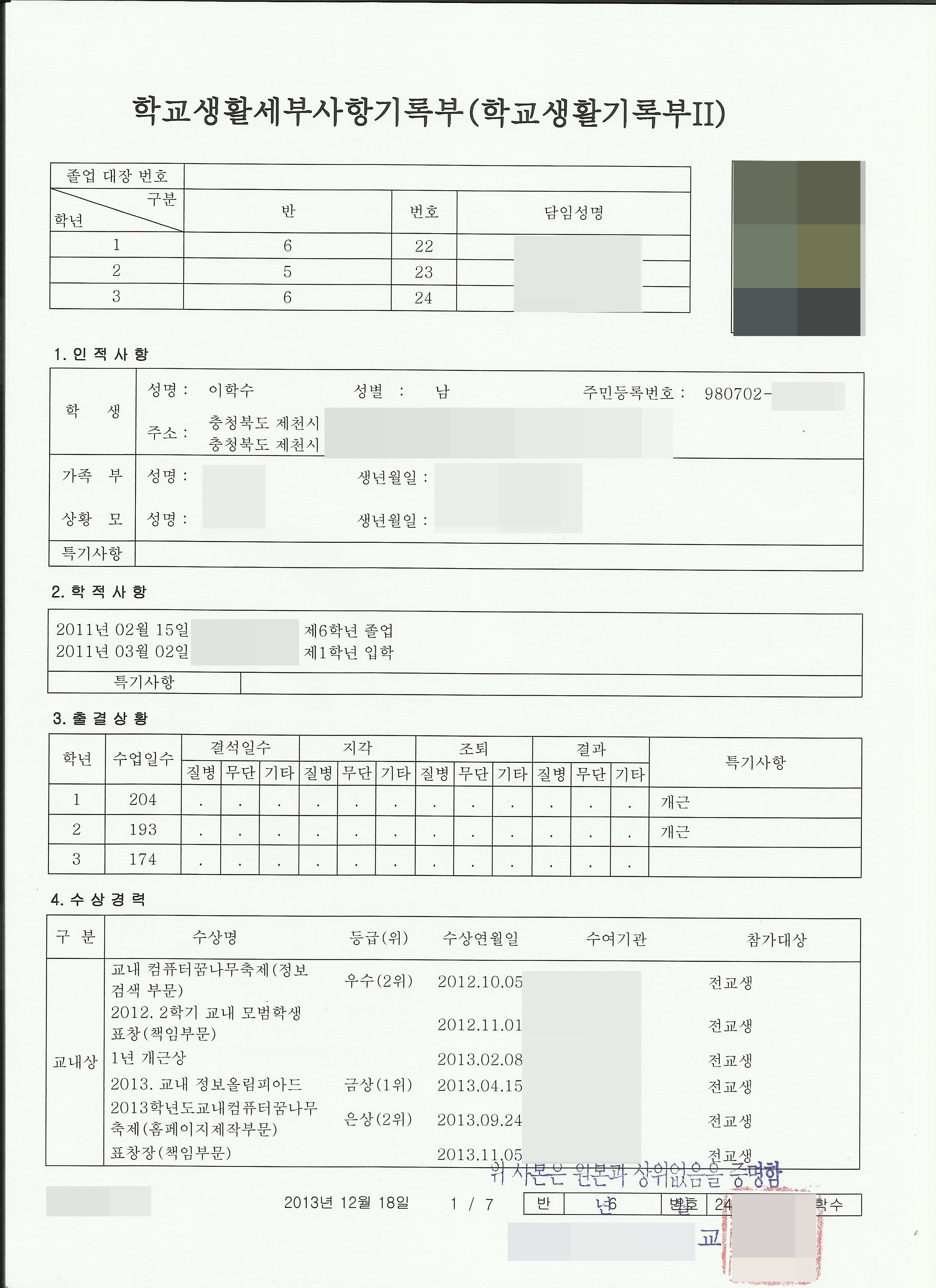 중학교 생활기록부 1페이지....... 원본대조필 까지 있어 ㅎㄷ